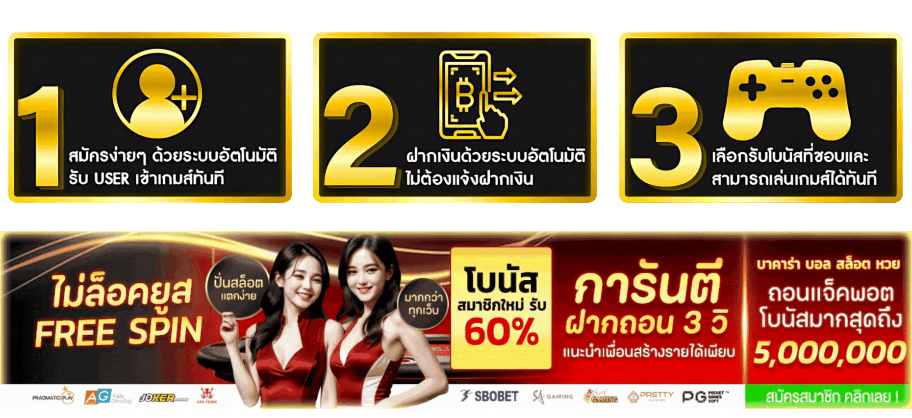 ตอบ : มีโบนัสต้อนรับ 100% สูงสุด 5,000 บาท, เครดิตฟรี 50 บาทเมื่อสมัครสมาชิก และคืนยอดเสีย 0.5% ทุกสัปดาห์